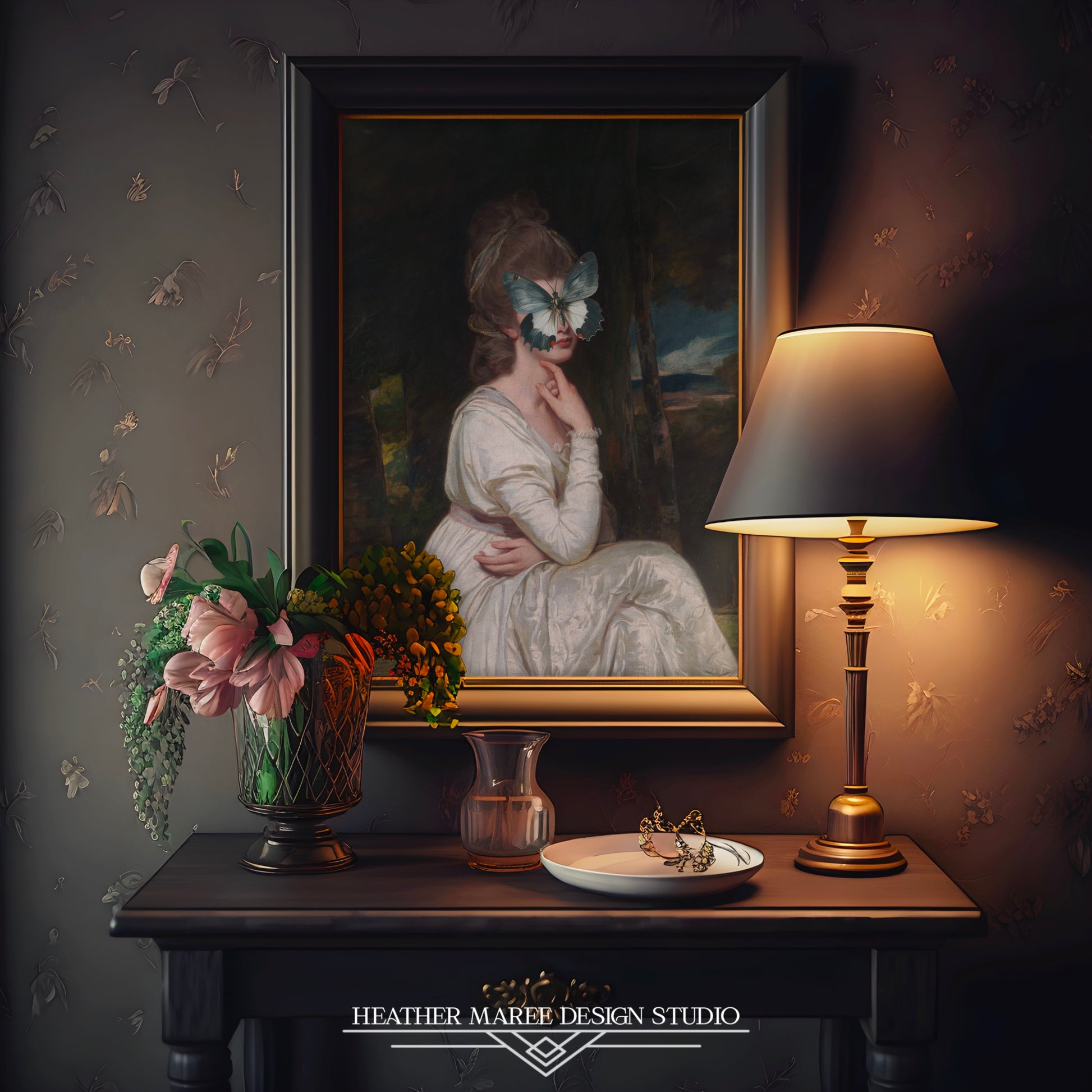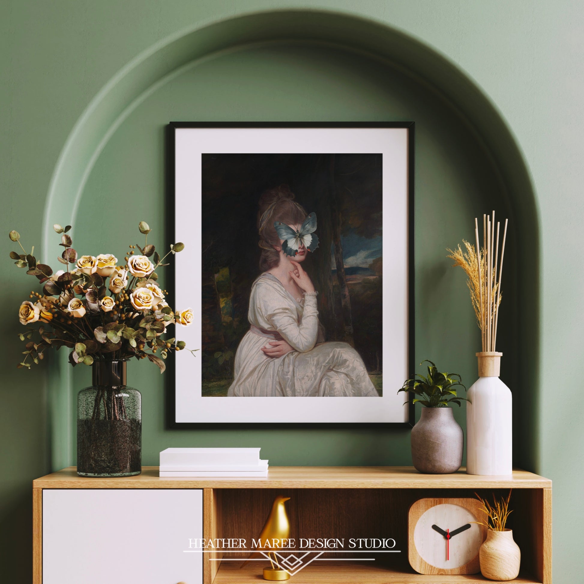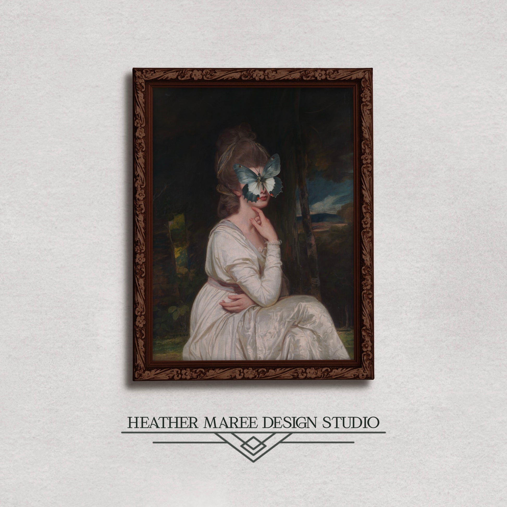 This altered vintage painting brings a delightful twist to classical portraiture. The elegant figure of a seated woman, dressed in a flowing white gown, exudes timeless grace and poise, but her face is playfully obscured by a large, ethereal butterfly. This unexpected surreal element transforms the traditional into something whimsical and mysterious, inviting the viewer to wonder what lies behind the butterfly's wings. The lush background of trees and sky provides a rich, earthy contrast to the delicate tones of the figure, blending the old with the fantastical in a way that feels both curious and captivating.