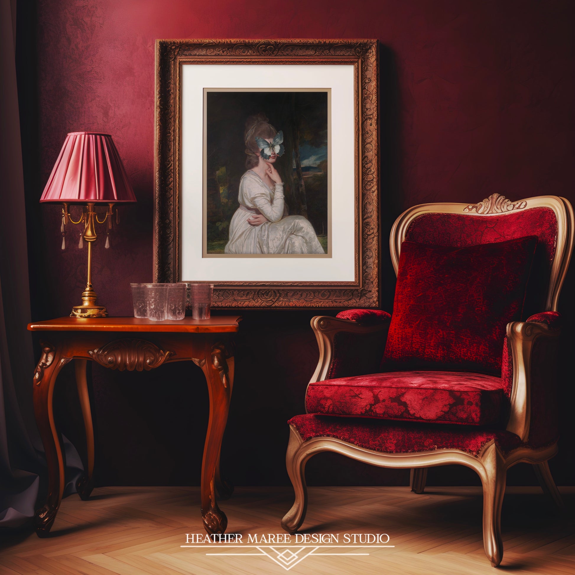 Available as a satin print in six different sizes, this artwork is a perfect fit for spaces with eclectic, bohemian, or maximalist aesthetics. Its mix of traditional portraiture and surreal elements makes it a great choice for rooms that embrace bold, artistic statements. It would feel right at home in a space filled with vintage finds, curated collections, or deep, moody colors. Whether placed in a living room, a creative workspace, or a cozy reading nook, this piece brings a touch of whimsy and sophistication to any decor.