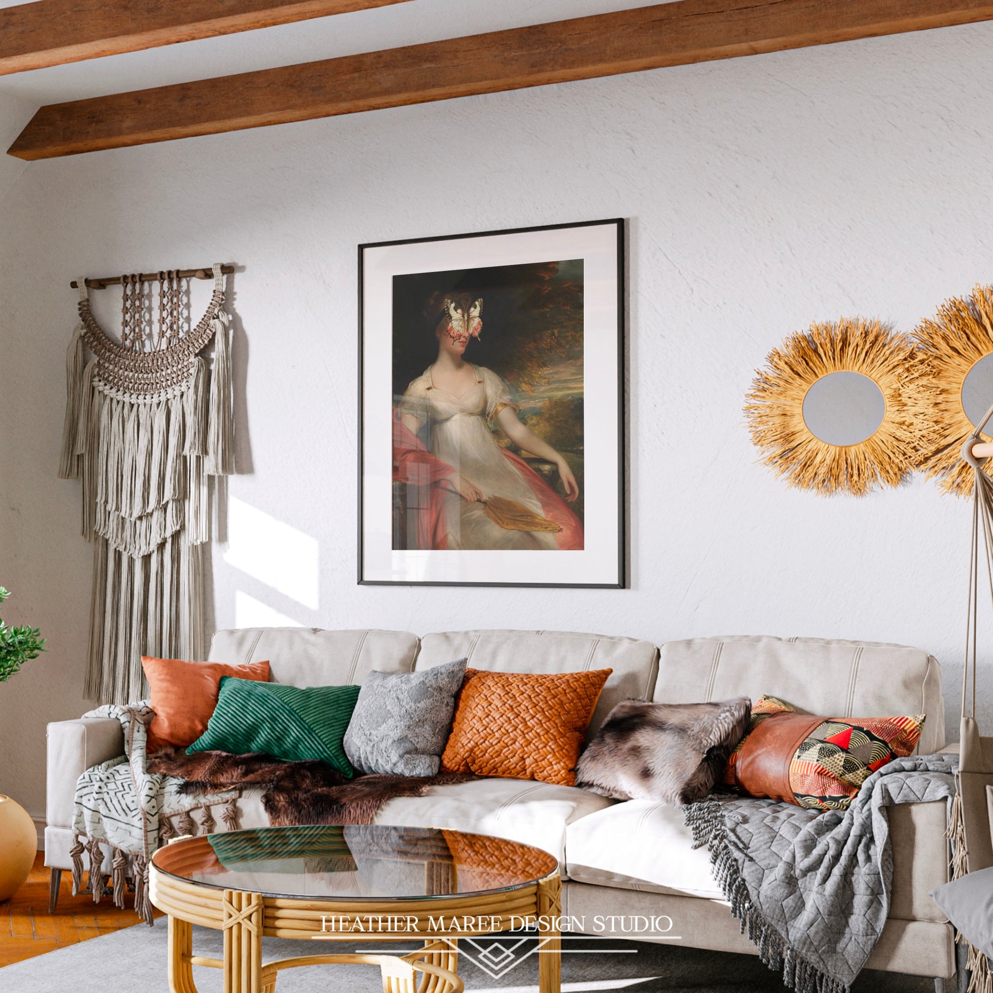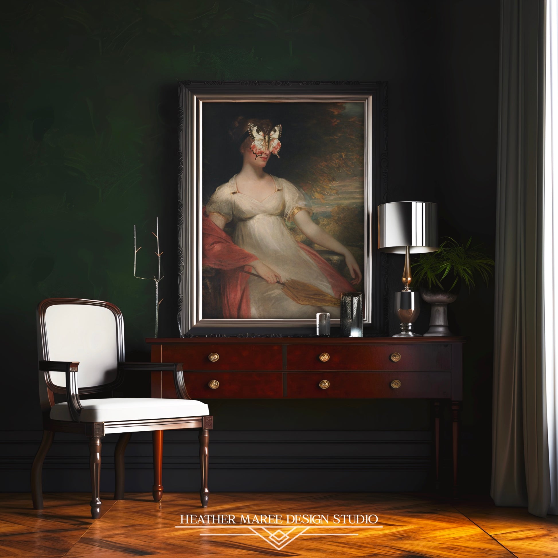 Our expertly retouched and altered art print reproduction features a charming young woman clad in an elegant ivory gown, complemented by a vibrant coral shawl. The classic setting takes on an imaginative twist with the presence of a butterfly partially obscuring her face, merging the classic beauty of the figure with a hint of surreal fantasy. The rich surroundings, paired with her graceful demeanor, inspire a feeling of everlasting elegance and quiet reflection.