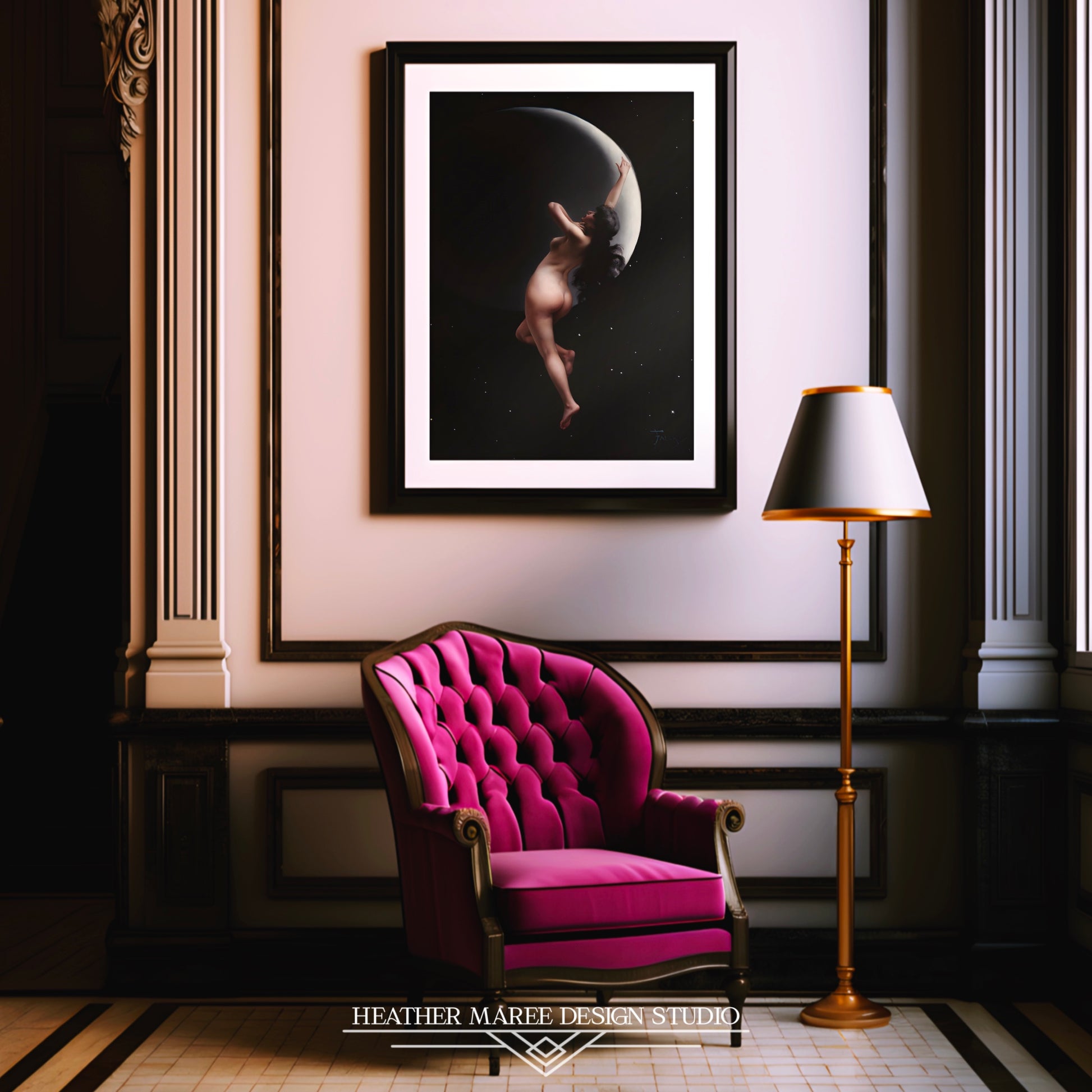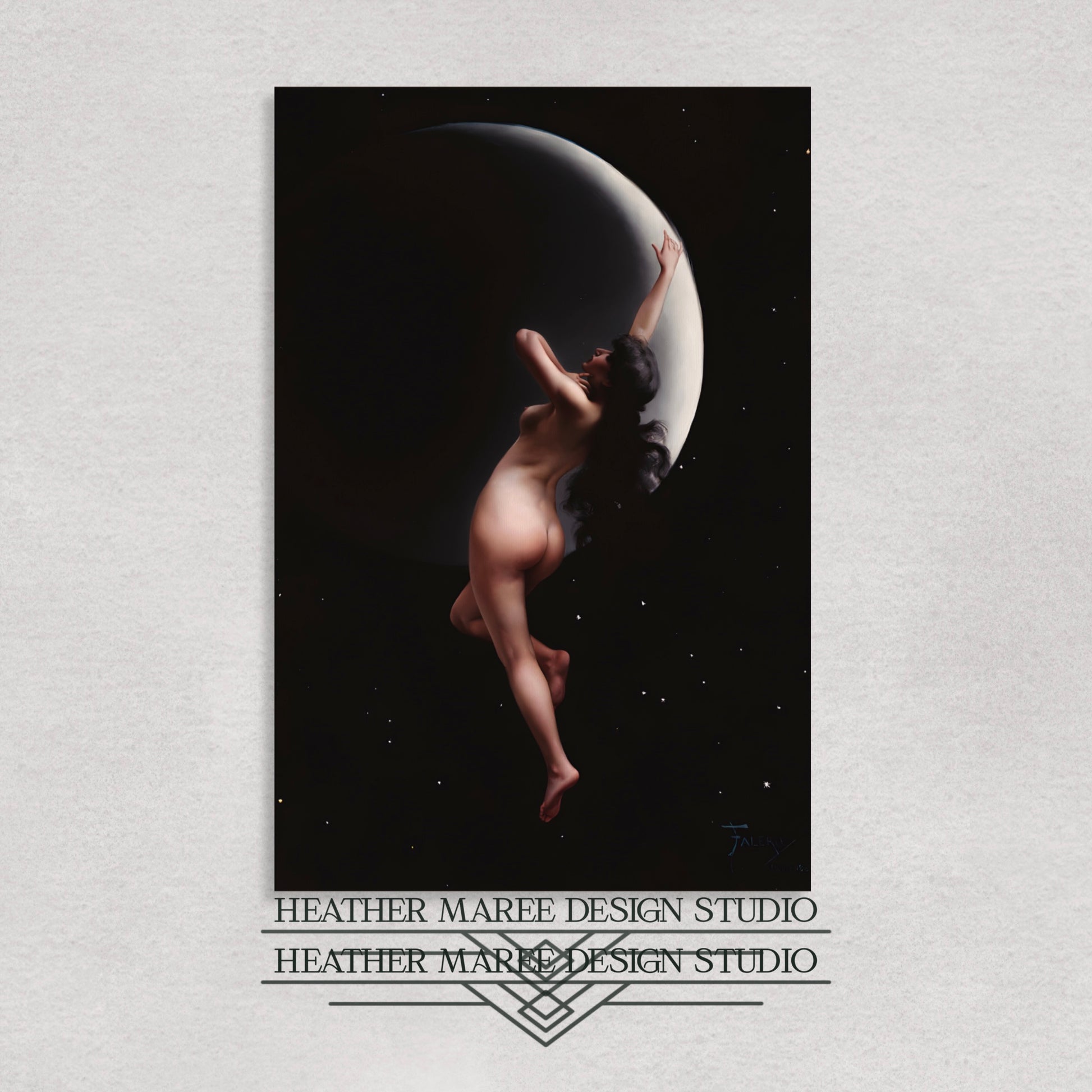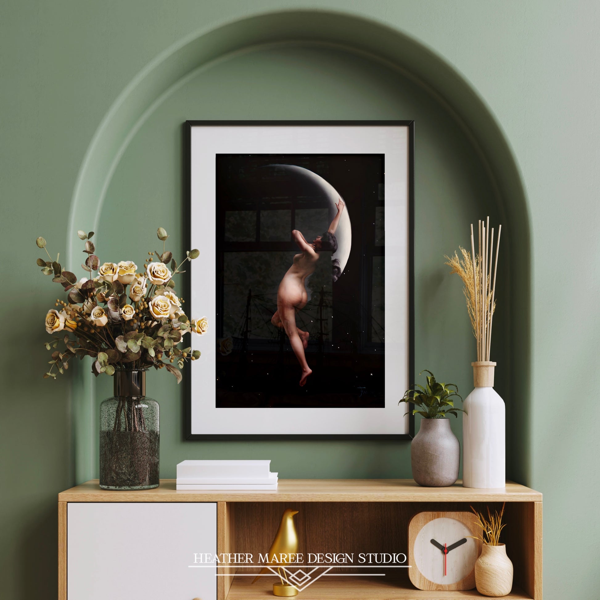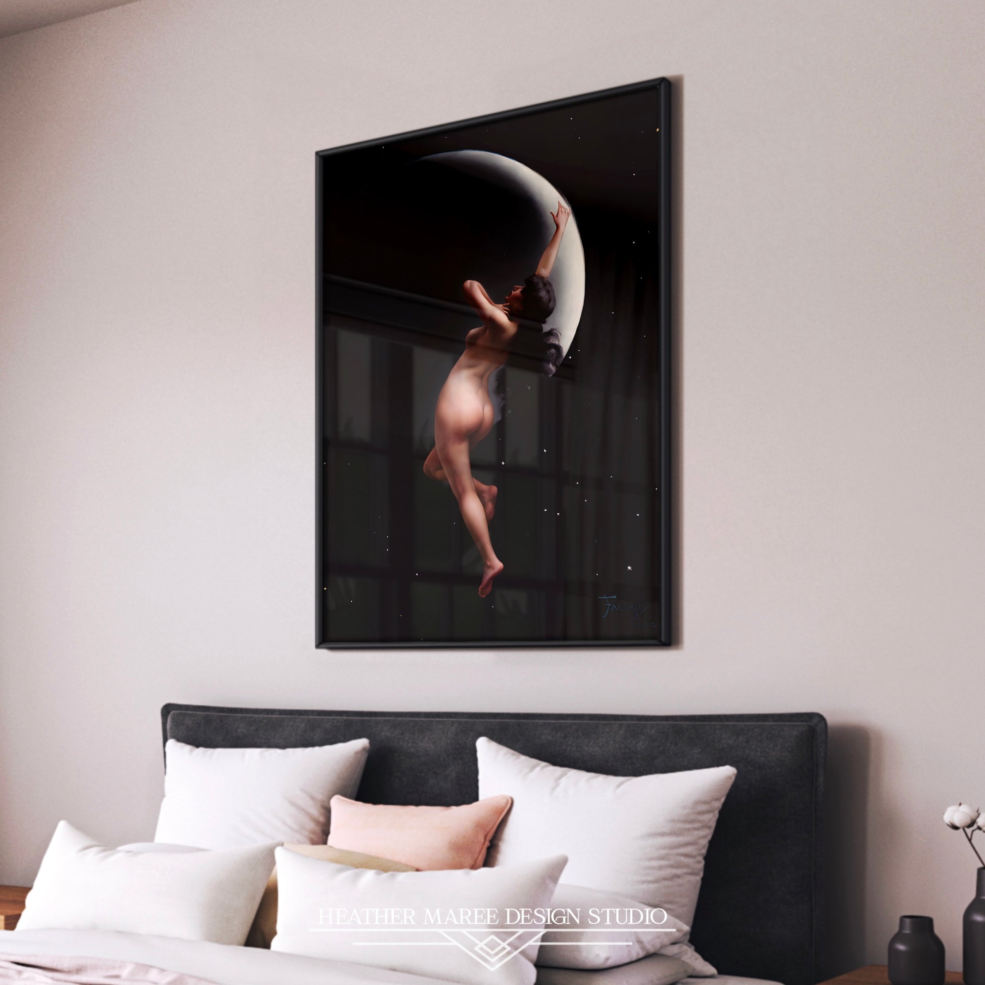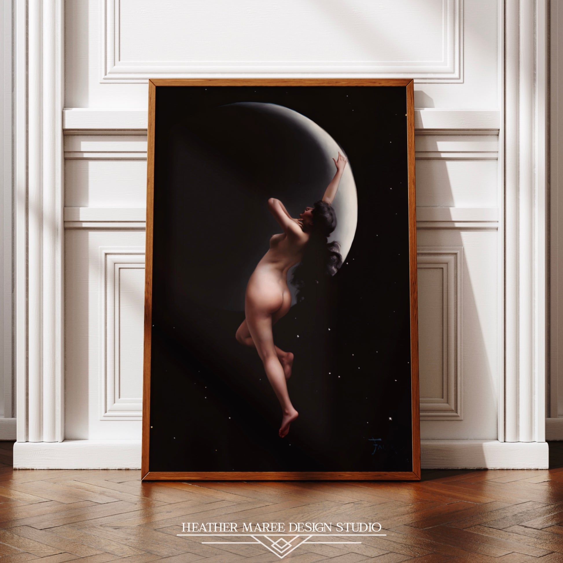 The Moon Nymph's ethereal charm also harmonizes seamlessly with gothic and witchy home décor, adding an enigmatic and sensual touch to your space. Whether you're curating an eclectic home décor style or searching for a striking centerpiece for your gallery wall, this artwork promises to elevate your ambiance with its exquisite allure.