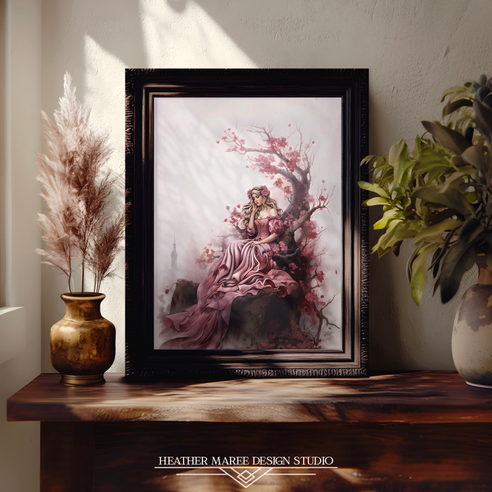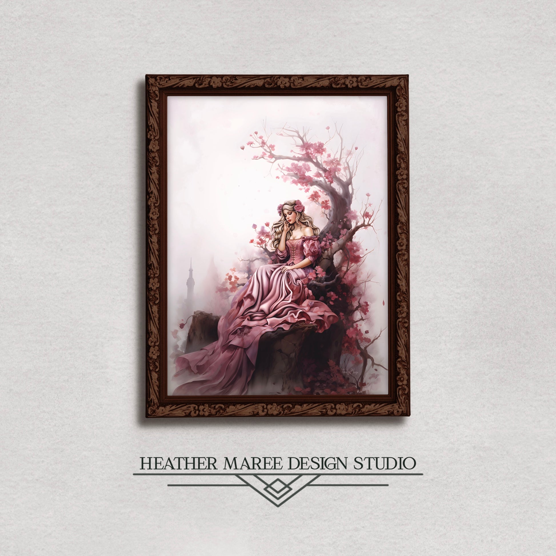Enter the enchanting world of fairy tales with this beautiful original digital painting featuring Sleeping Beauty seated on a captivating throne crafted from a magical tree adorned with pink blooming flowers. Draped in a pink and lilac gown, Sleeping Beauty exudes contemplative grace, with pink flowers delicately woven into her hair. The muted pale pink background sets the stage for this ethereal scene, complemented by a color palette of cool browns, pinks, lilac, and beige, infusing the artwork with a sense of whimsical serenity.