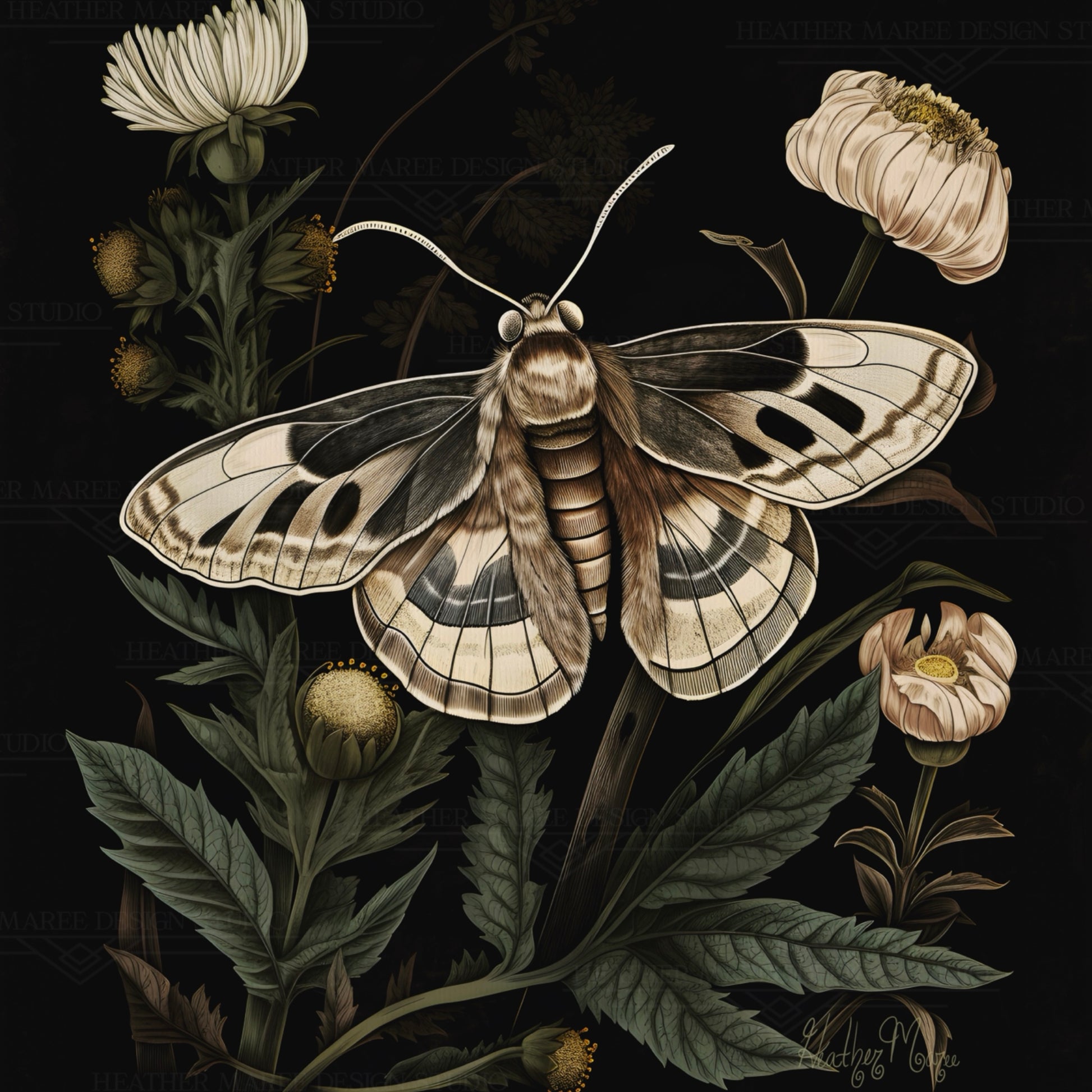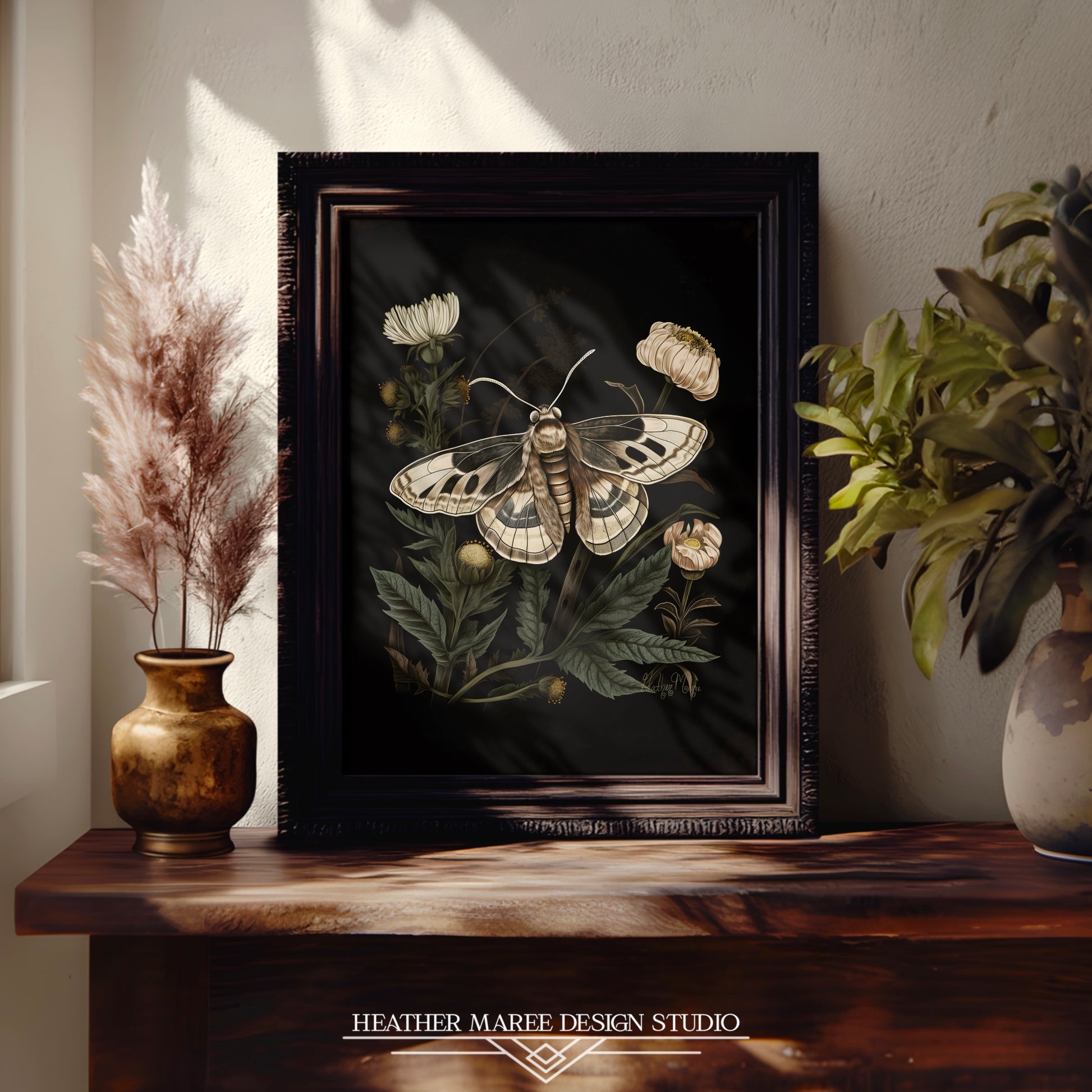 A stunning celebration of nature’s quiet elegance, this original artwork features a beautifully detailed moth nestled among delicate wildflowers and lush greenery. The soft, neutral tones of the moth’s wings blend harmoniously with the earthy hues of the florals, while the dark background creates a dramatic contrast that highlights every detail. This piece captures the serenity and timeless beauty of the natural world.