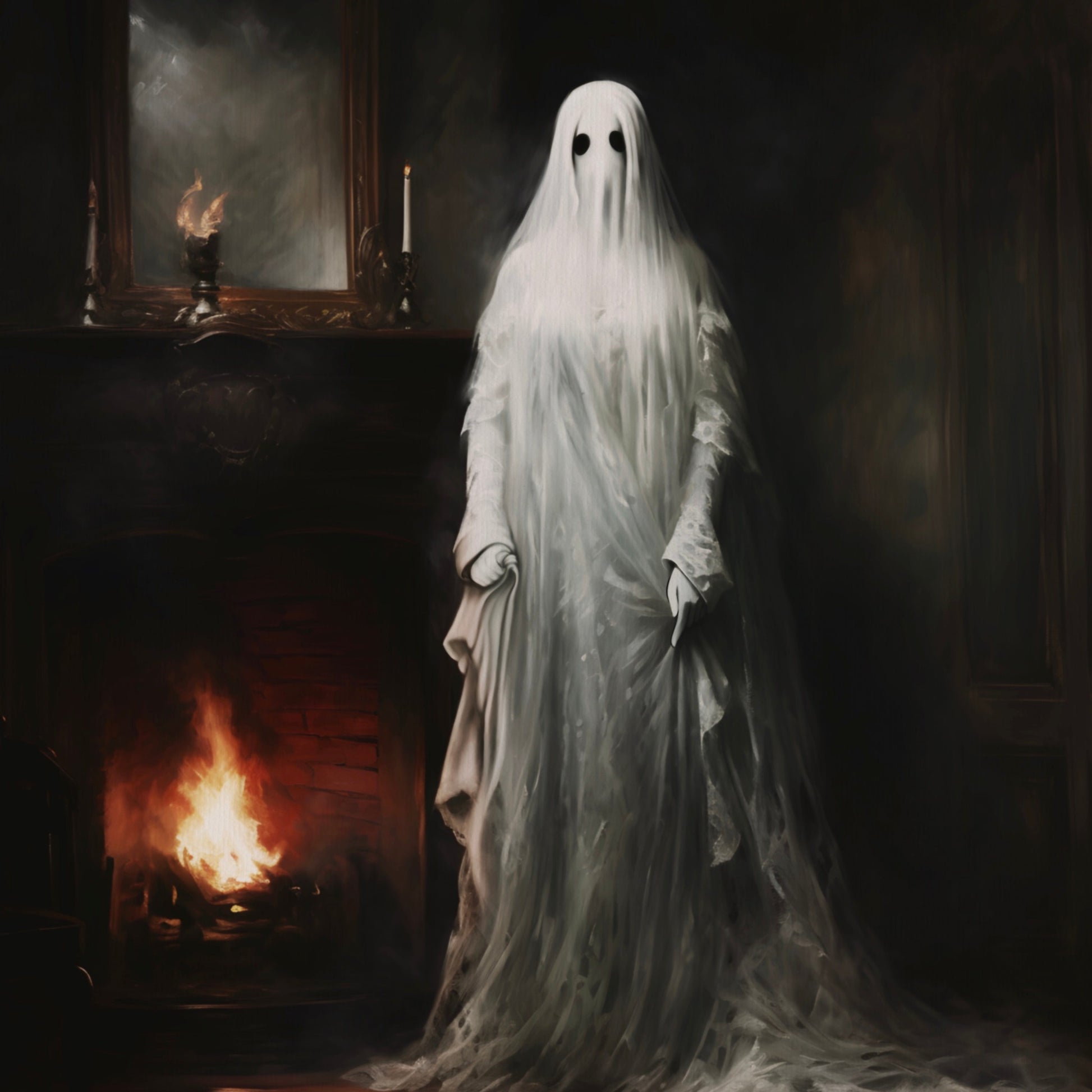 This enthralling original digital oil painting captures the enigmatic essence of a female specter in a hauntingly evocative scene. The ghostly figure stands amidst the dimly lit, moody room, her penetrating gaze seeming to pierce through the very fabric of reality. Behind her, a fireplace flickers with a faint, ethereal flame, casting eerie shadows that dance upon the walls. The delicate interplay of light and shadow in this artwork creates a captivating, almost unsettling atmosphere, where the spectral beauty of the female figure invites you into her world, shrouded in mystery and allure.