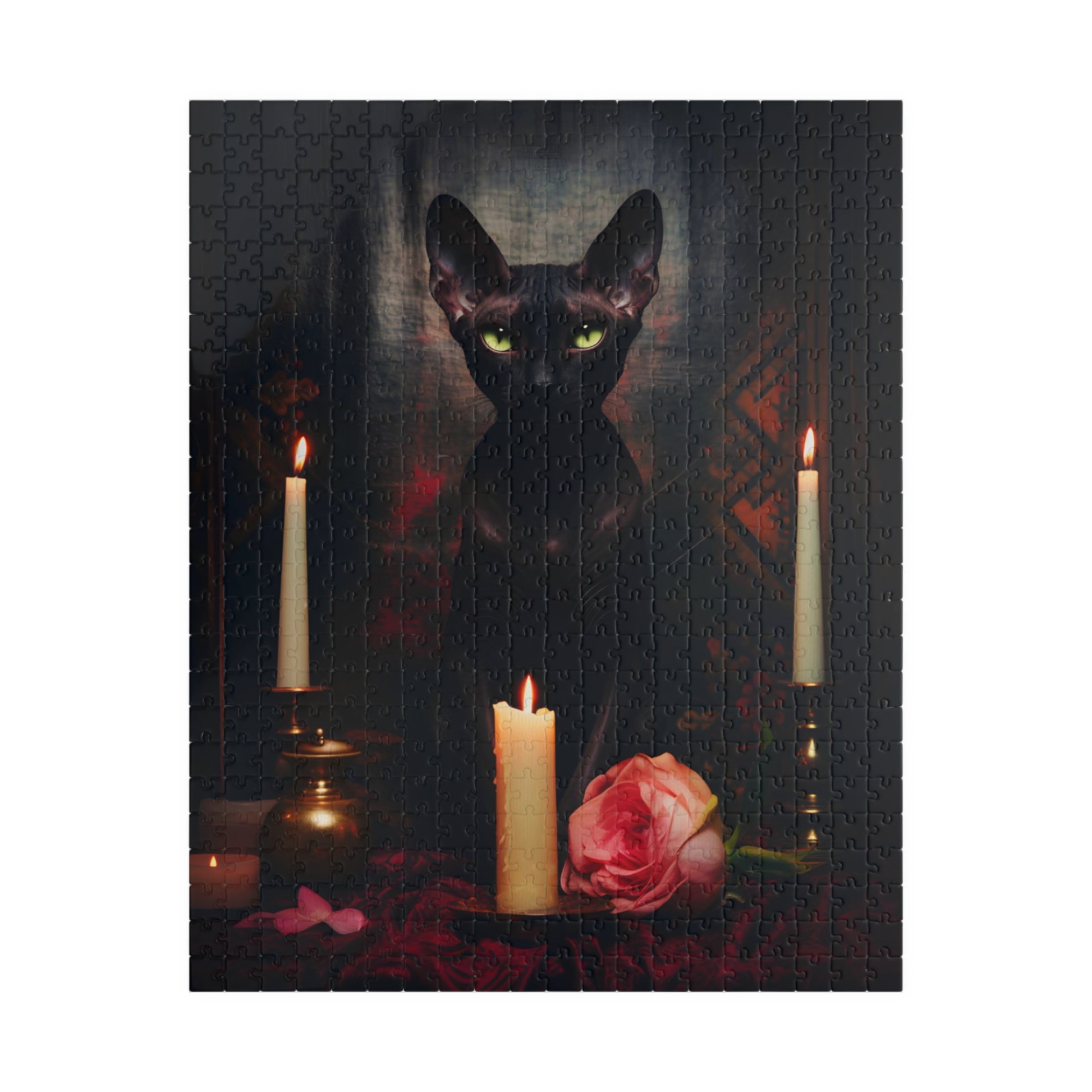 This enigmatic digital painting of a black Sphynx cat with dreamy green eyes, welcomes you into a realm of intrigue. This regal cat is poised upon a table draped in luxurious burgundy, surrounded by the soft glow of alluring candles and the delicate charm of a single pink rose. This puzzle would be an excellent gift for someone who loves moody vintage inspired oil paintings and mysterious sphynx cats. Once the puzzle is completed it can be turned into a beautiful wall hanging 🖼️💖