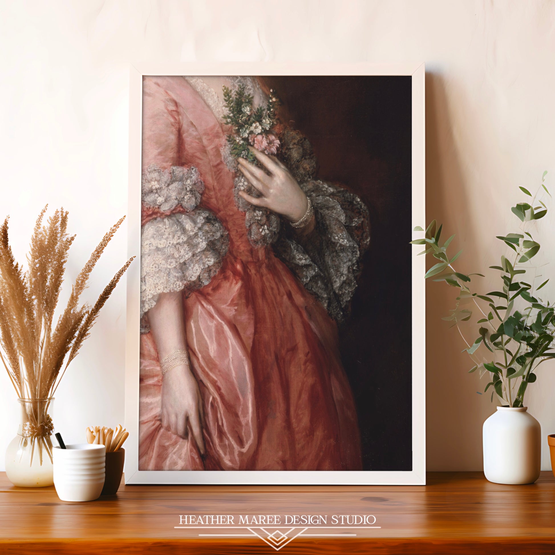 Explore the exquisite details of our digitally altered vintage painting, a captivating close-up inspired by the grace of the past. The focal point is a peach bodice adorned with delicate white lace, creating a timeless and elegant visual. The dainty hand delicately holding small pink and white flowers against the chest adds a touch of delicate charm, while delicate pearl bracelets on each arm enhance the overall sophistication. The warm deep brown background enhances the overall warmth of the piece, while delicate pearl bracelets on each arm contribute to the refined aesthetic.