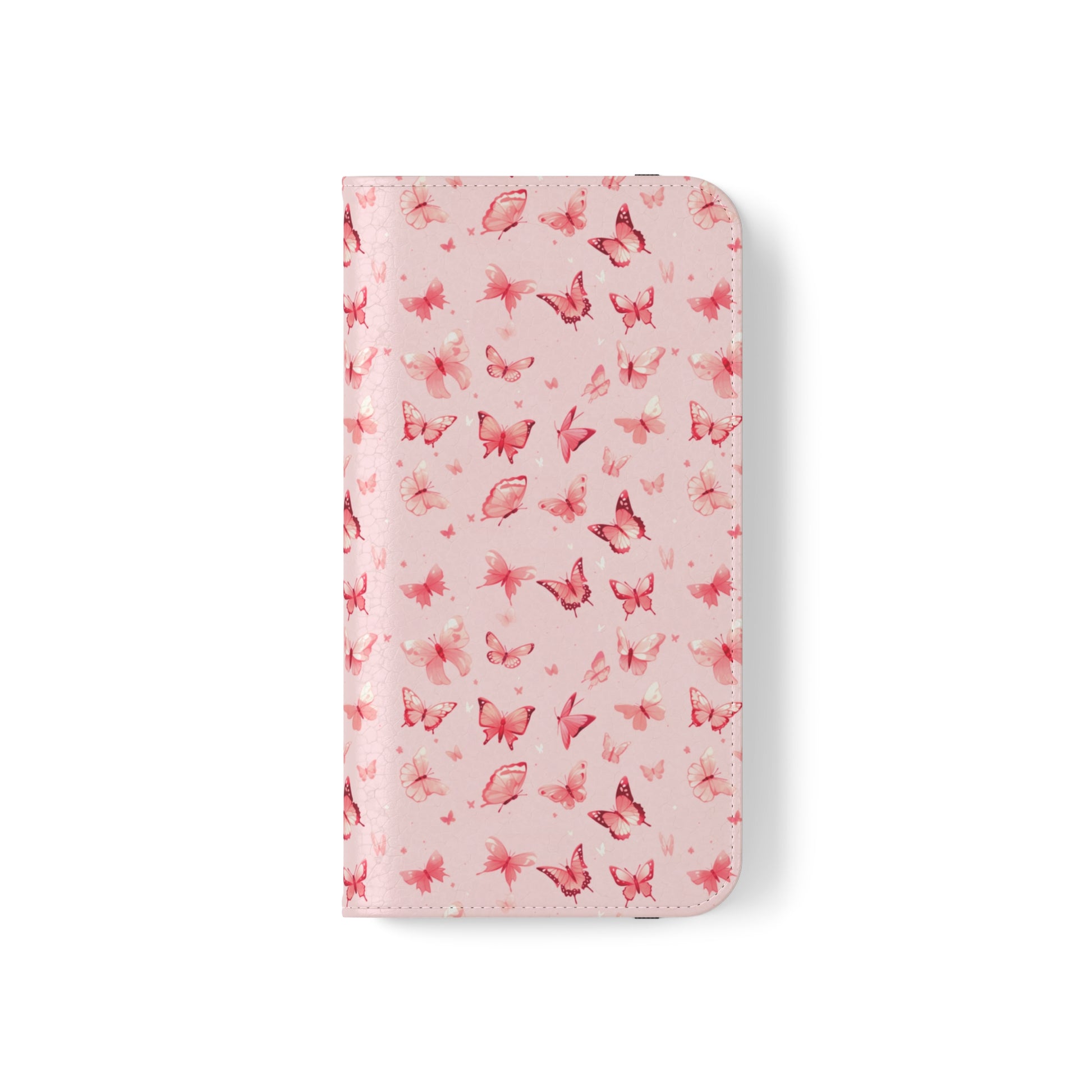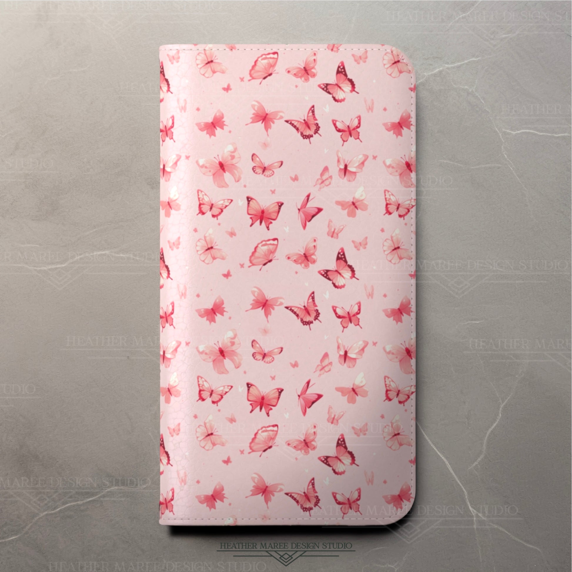 Wrap your phone in the enchanting charm of our exclusive pink butterfly vegan leather wallet phone case! This delightful accessory features a captivating dance of cute pink and white butterflies on a soothing pastel pink canvas. Heighten your phone's style with this chic and cruelty-free accessory, embracing the latest fashion aesthetics in a delightful and original way.
