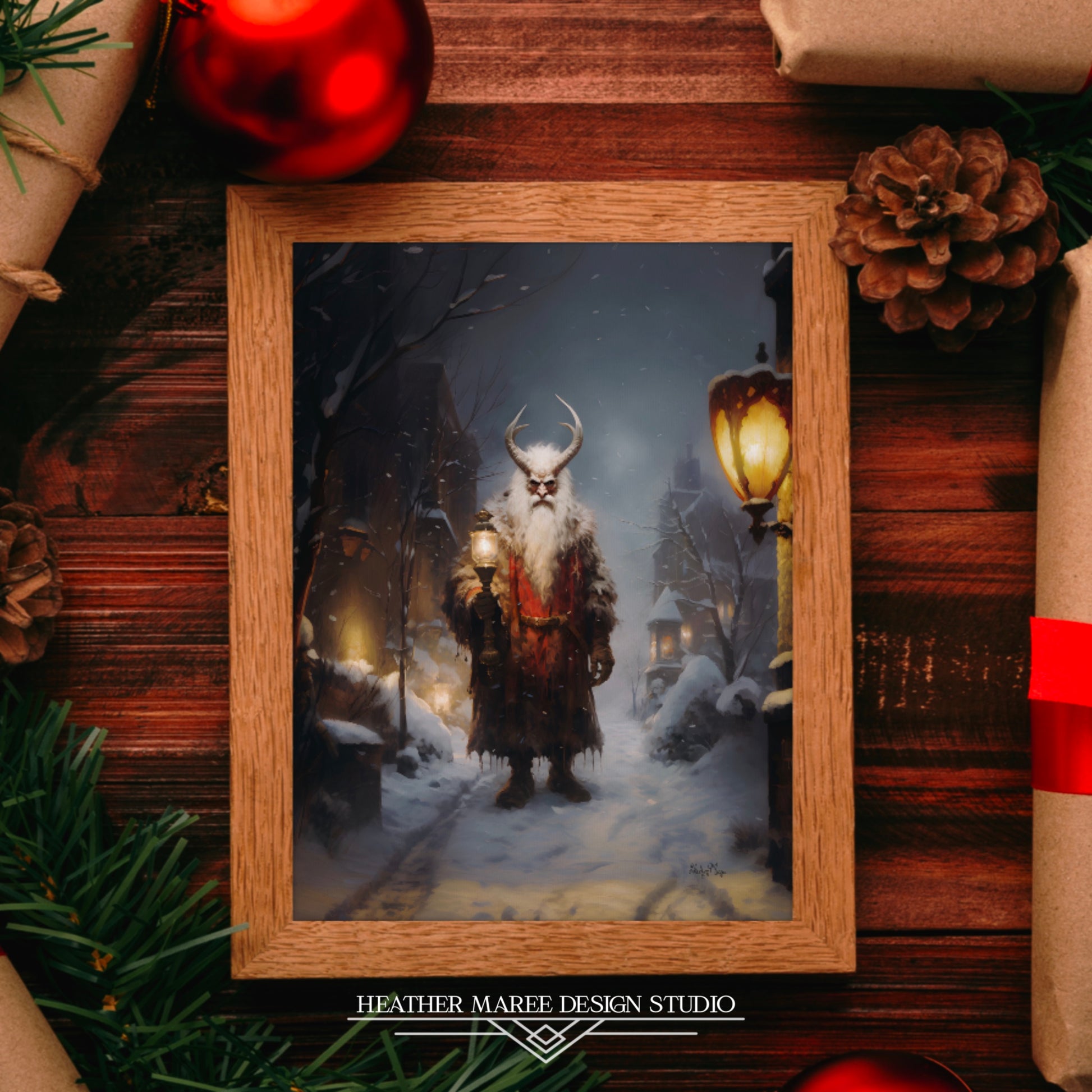 Gaze into a haunting scene where the imposing figure of Krampus emerges from the depths of the dark and snowy urban city street. Lit only by the eerie glow of his lantern, Krampus's piercing gaze invites curiosity and trepidation. The murky sky sets the stage for an otherworldly encounter, as swirling snowflakes add a touch of magic to the chilling atmosphere.