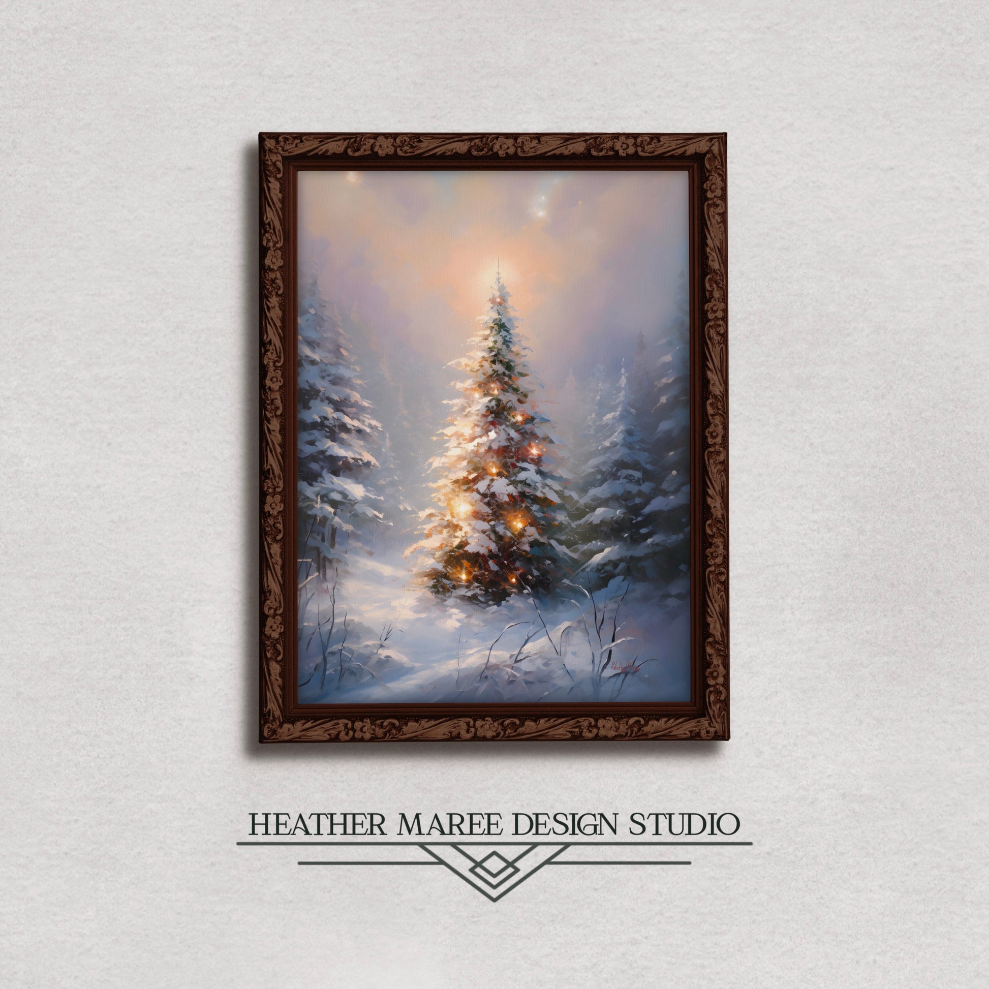 Elevate your living space with the ethereal beauty of this original limited edition digital impressionist painting, capturing the serene allure of a snow-covered evergreen forest. At the heart of the canvas stands a majestic evergreen, elegantly adorned with delicate Christmas decorations and soft, twinkling lights 🎄❄️