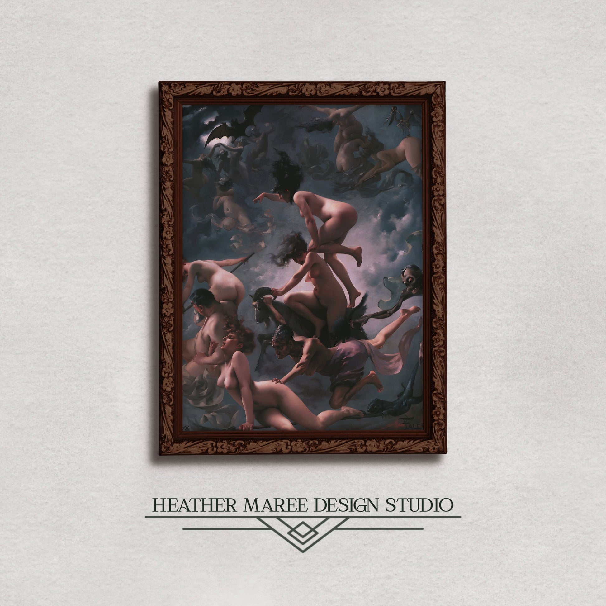 This artwork is the ideal addition to your gothic home décor, bringing an air of dark romanticism and mysticism to your surroundings. It also seamlessly complements eclectic home décor, offering a unique focal point that's bound to ignite conversation and curiosity among your guests. Embrace the maximalist-inspired aesthetic, and let "Witches going to their Sabbath" cast its spell upon your interior, turning it into a realm of captivating intrigue and timeless fascination.