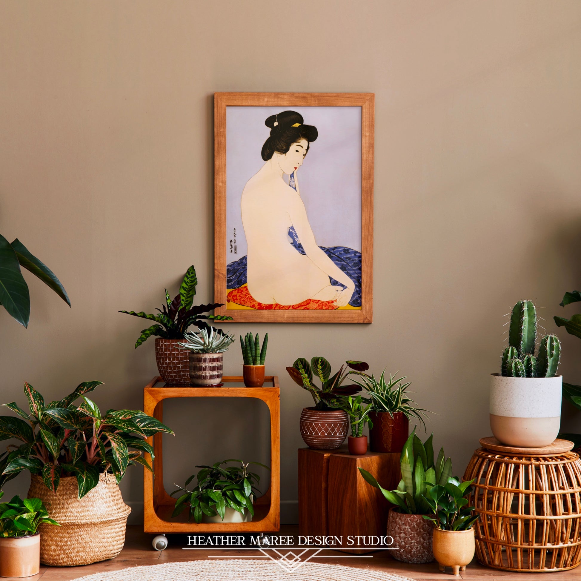 With its delicate lines and meticulous detailing, this art print effortlessly complements an array of home décor styles, from the eclectic to the harmonious simplicity of Japandi décor. This digitally enhanced art print is a testament to the enduring appeal of traditional Japanese artwork, making it a cherished choice for enthusiasts seeking a connection to Japan's rich artistic heritage. Beyond its cultural significance, this artwork also caters to connoisseurs of tasteful nude art, capturing the human form in a refined and captivating manner. As a decorative piece, it strikes a perfect balance between classic charm and contemporary allure.