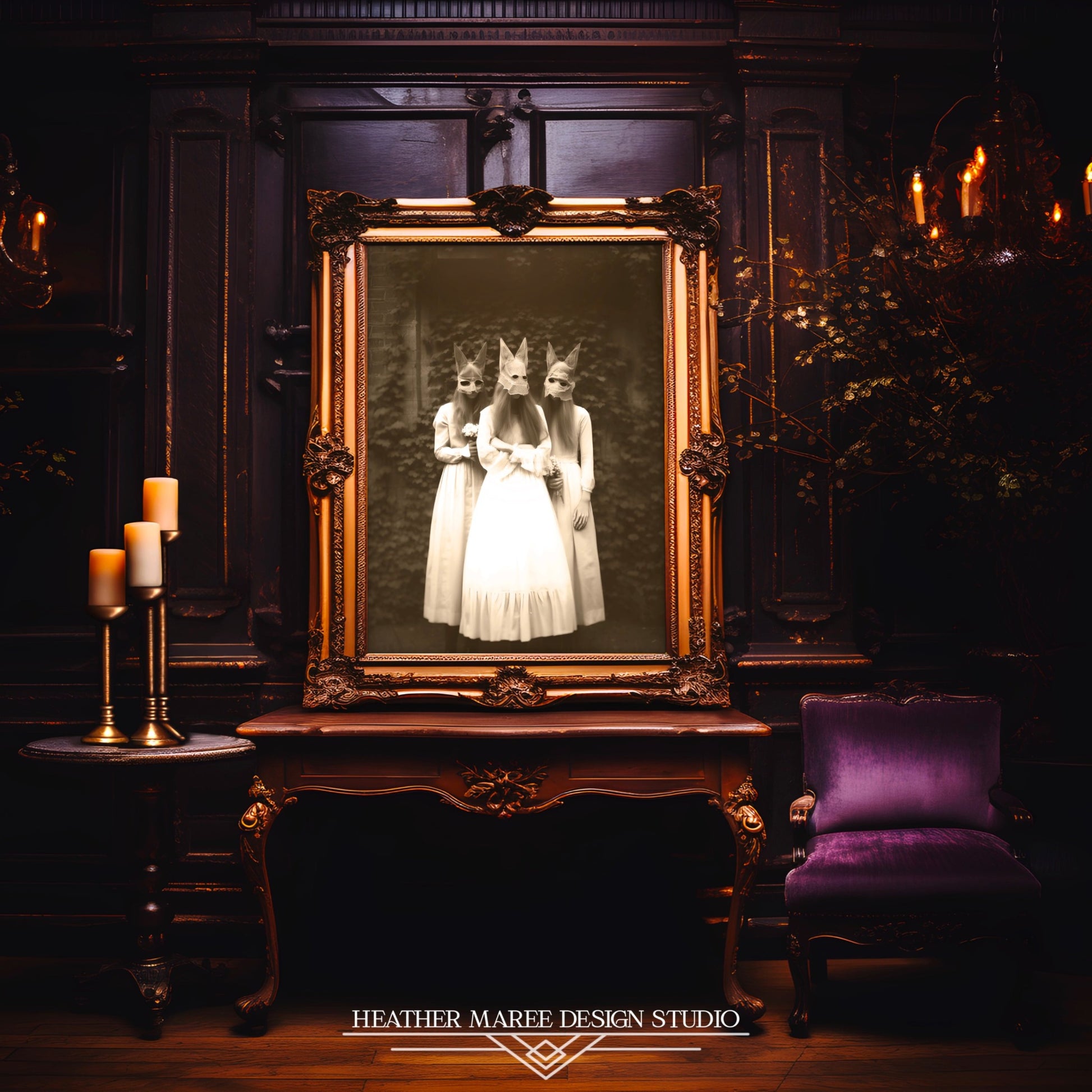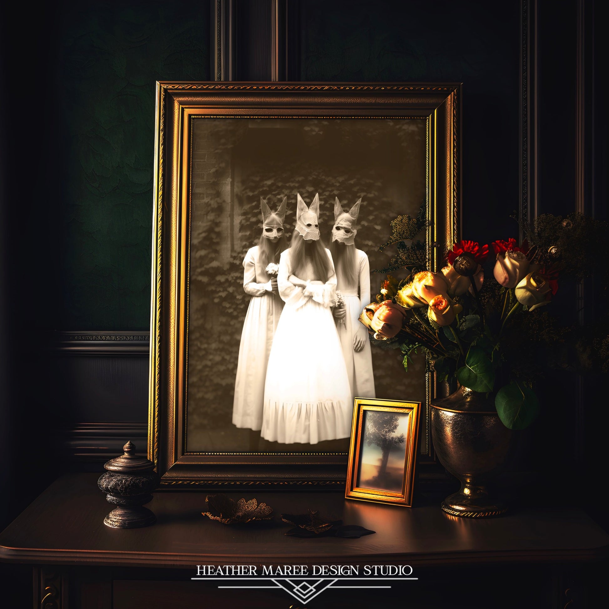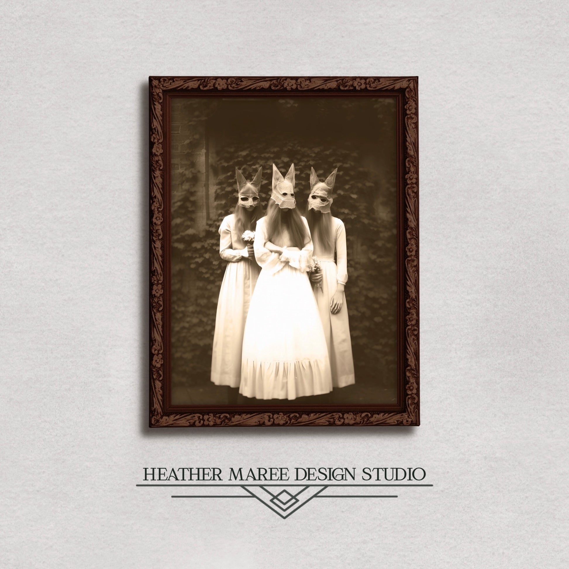 Indulge in the timeless allure of this vintage-inspired artwork, a meticulously crafted photograph capturing the essence of the Edwardian/Victorian era. In this composition, three women adorned with eerie cloth animal masks create an evocative tableau that seamlessly blends historical elegance with a touch of mystique.