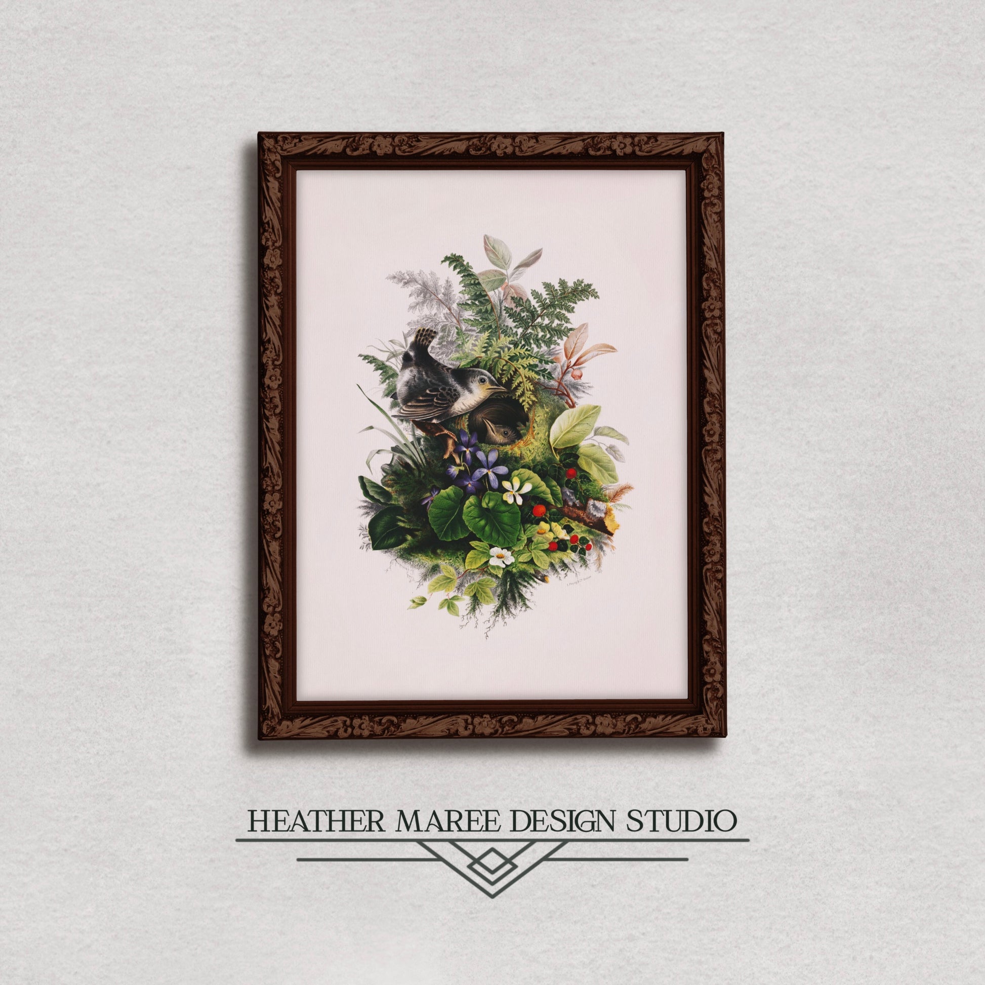 A beautifully altered and enhanced vintage artwork revealing an intricate ballet of two wrens, one perched outside the nest, the other nestled within. Set against an antique beige backdrop, adorned with a rich palette of greens, browns, reds, whites, and hints of deep purple, this artwork is a symphony of nature's hues. Each stroke tells a distinctive tale, inviting you to wander through a canvas where the eloquence of the wild meets the magic of artistic expression.